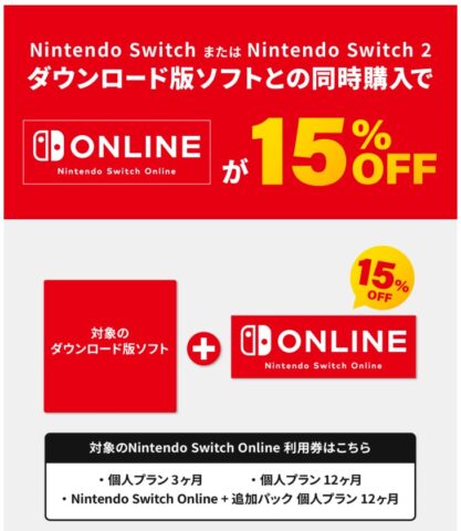 ですが、ブラックフライデー期間中はポイント還元が通常より多く、対象のDL版ソフトと同時購入でNintendo Switch Onlineが15%OFFになるので超お得!