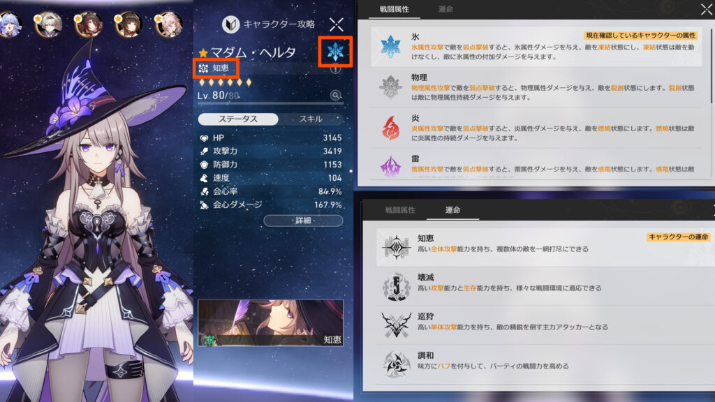 例えば、マダム・ヘルタの場合だと「氷属性で知恵の運命を歩むキャラ」となっているため、「全体攻撃が得意で、弱点撃破時に敵を凍結させる能力がある」ということです。