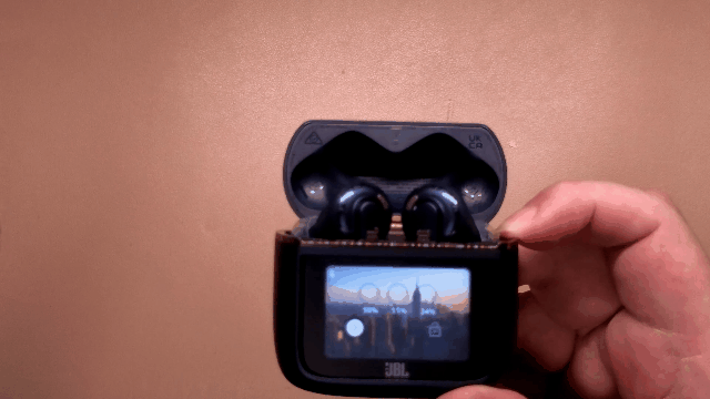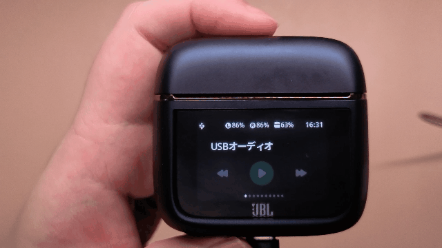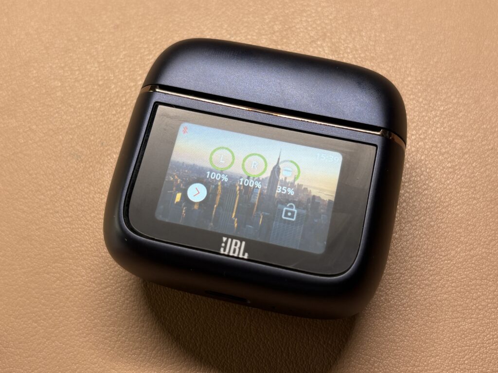 JBLのイヤホンといえば、やはりケースに搭載されたスマートタッチディスプレイが特徴です。