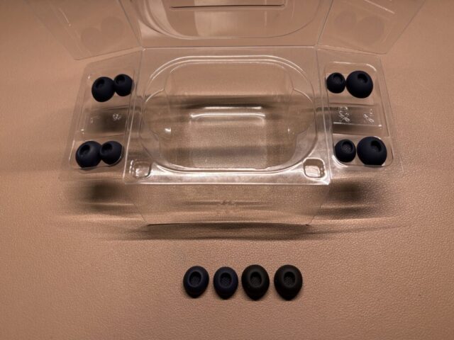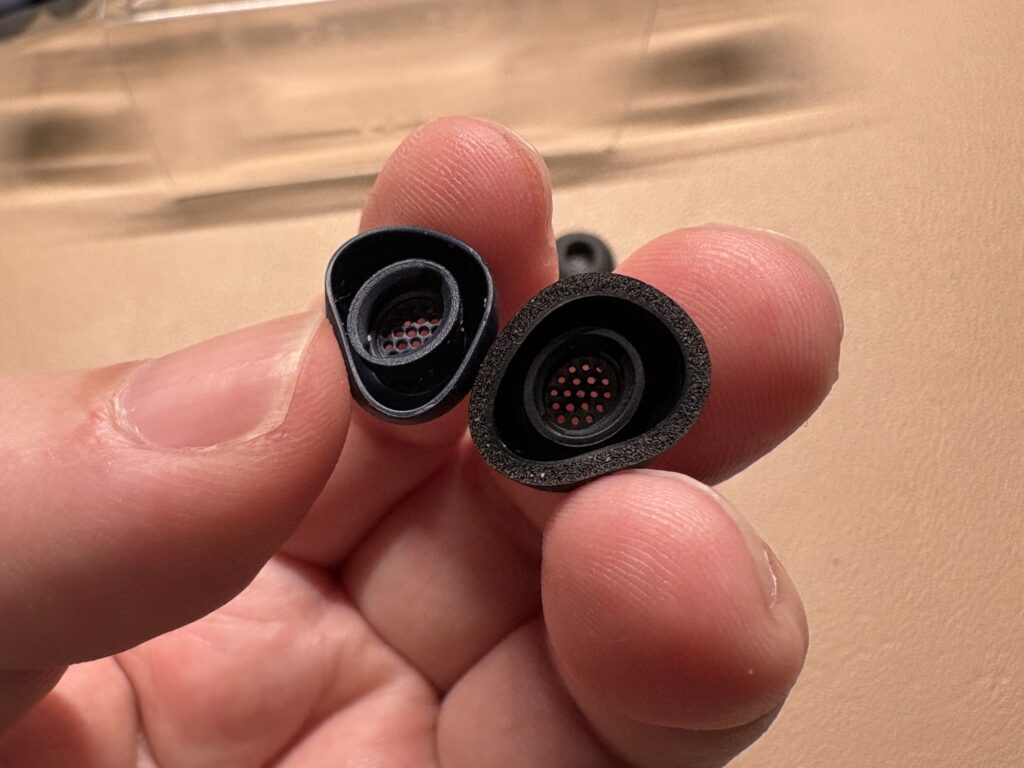 通常、フォームイヤーピースは内部までぎっしり詰まっていることが多いのですが、JBL TOUR PRO 3の付属品は 中心がくり抜かれた構造になっています。