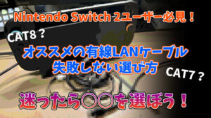 世の中にはCAT7とかCAT8のケーブルとか出ていますが、Switch 2はもちろんのこと、一般的なパソコンでさえ基本的には「10GBASE-T」に対応したCAT6Aのケーブルで十分です。