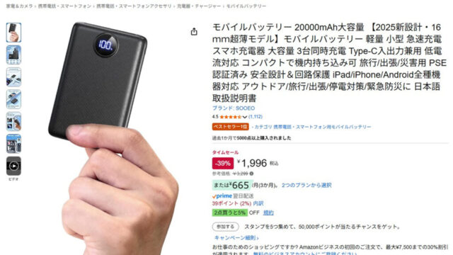 例えば、Amazonでたまたま見つけたこのモバイルバッテリー。